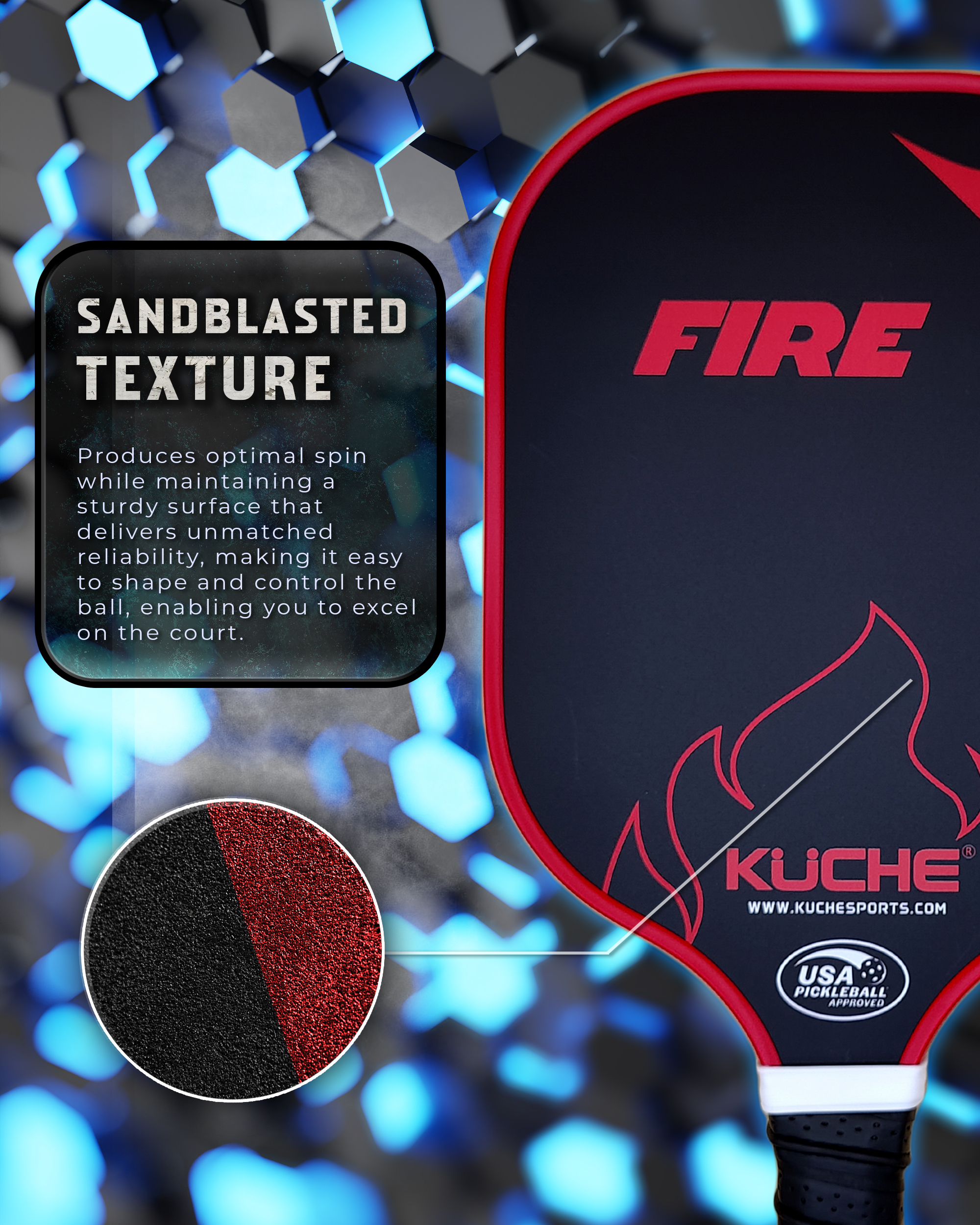 This Kuche paddle is manufactured with a Polymer Honeycomb Core & Sandblasted rough T700 carbon surface to provide accuracy and spin without worrying about your hand position.