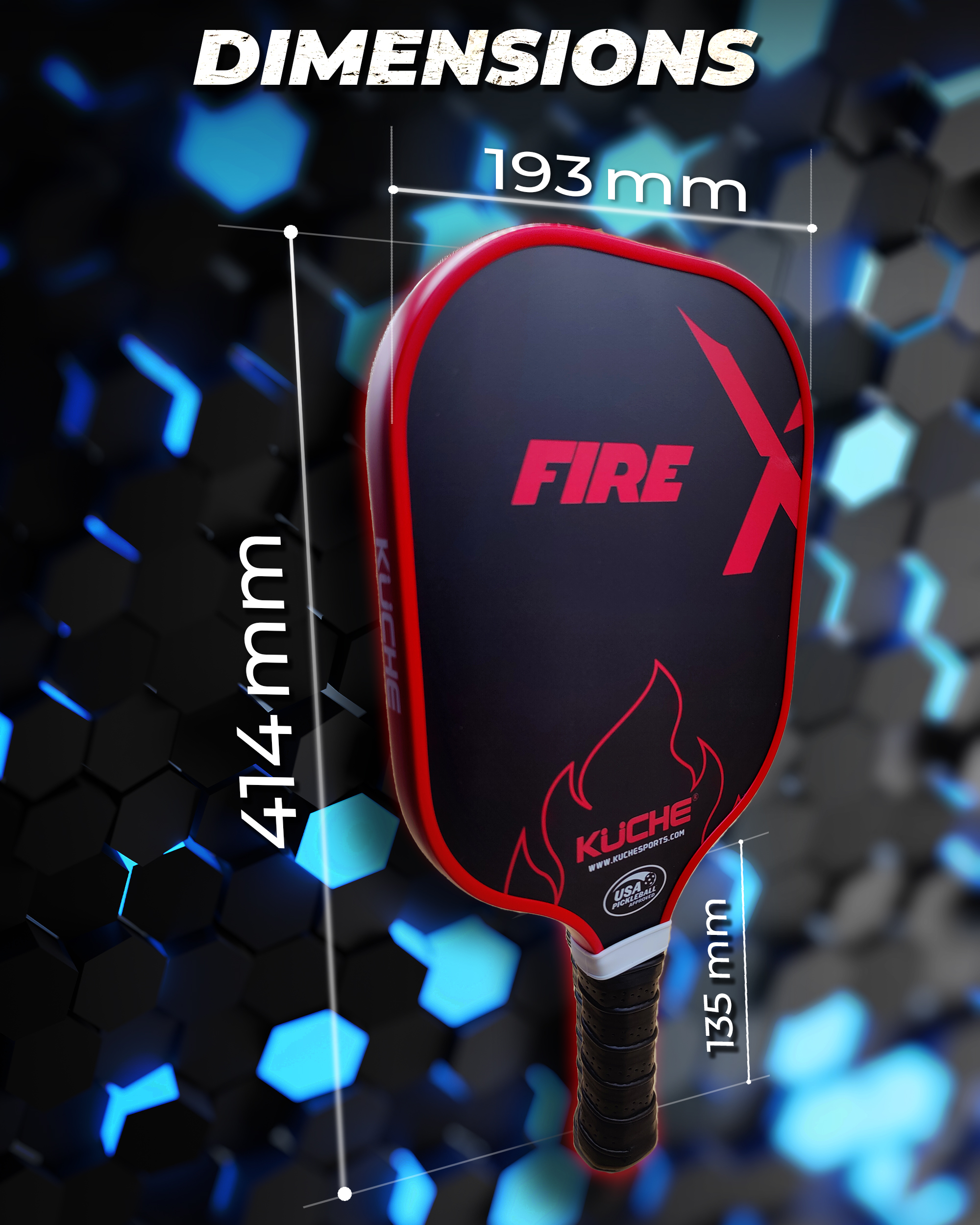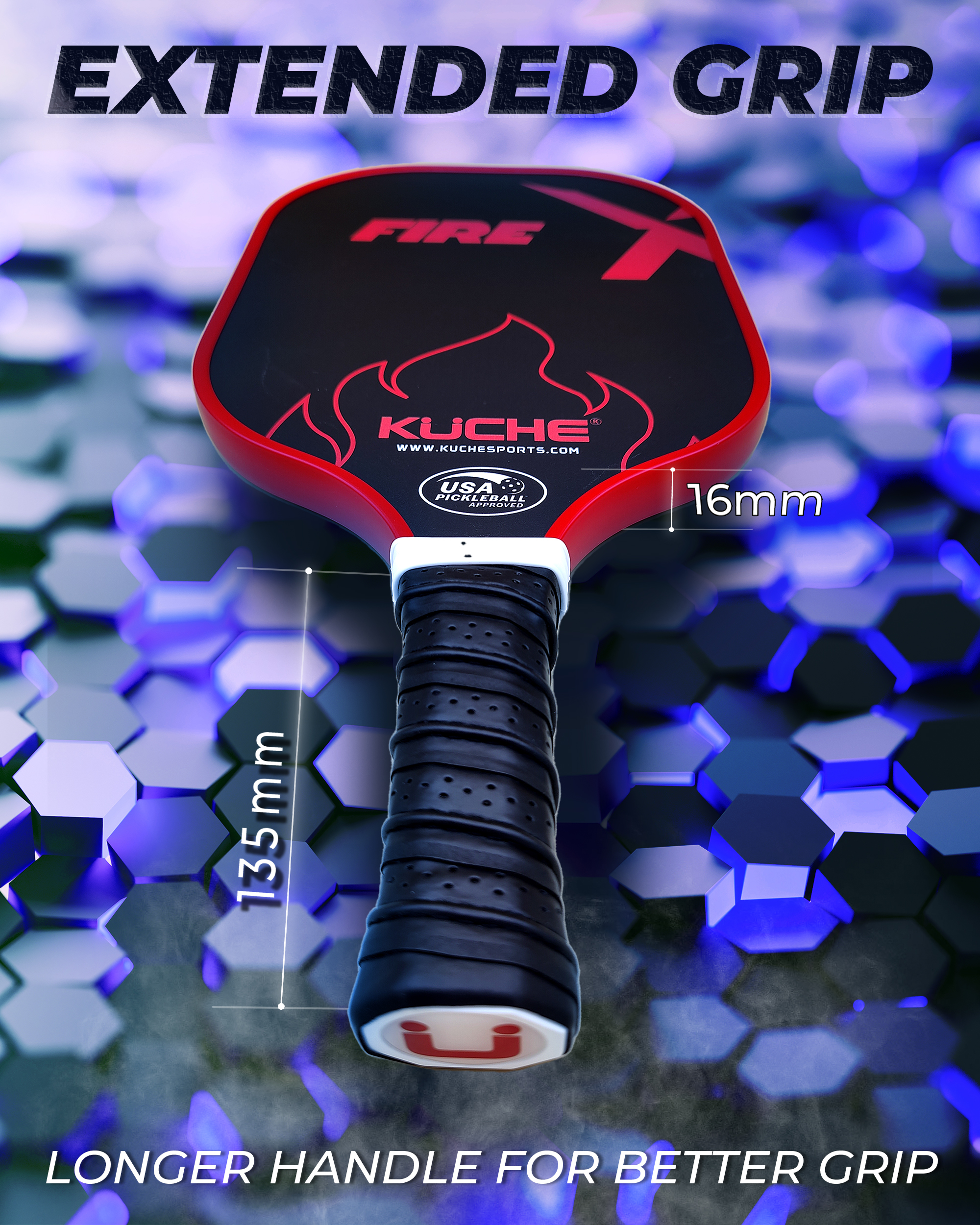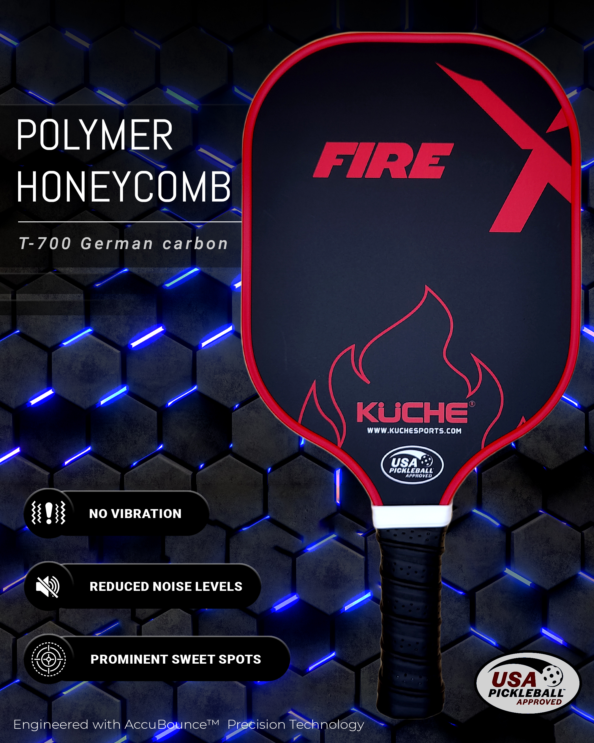 Kuche Sport’s new paddles are designed by racquet sports experts with over 30 years of experience. Utilizing a T-700 German carbon surface technology with a denser Polymer HONEYCOMB core backed by ACCUBOUNCE precession Technology provides an impressive combination of Power, Balance, Control and consistency in every shot. A more prominent sweet spot, no vibration, and reduced noise levels are ideal for all levels of players.